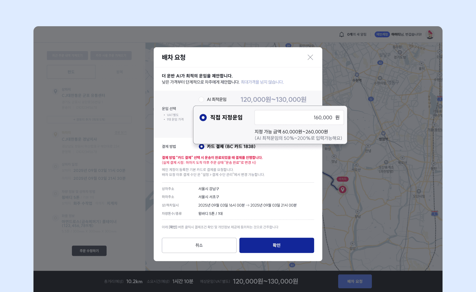 이번 업데이트에서는 AI최적 운임, 직접 지정 입력 중 상황에 맞게 운임을 선택할 수 있는 기능이 새롭게 제공됩니다.
